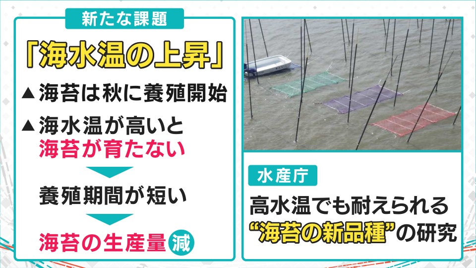 海苔は秋に養殖が始まるのですが、最近は海水温が上昇しているためノリの苗が育たないといいます。
