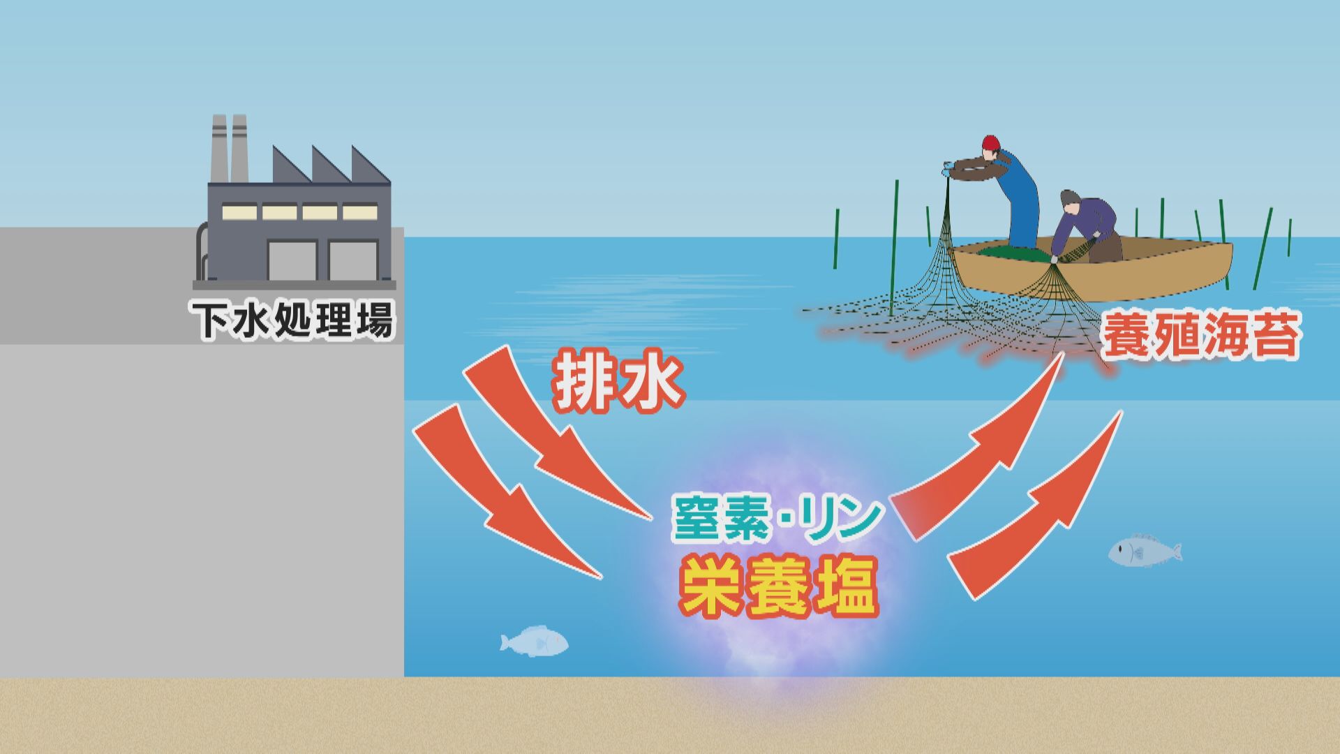 兵庫県では2019年度からあえて「きれい過ぎない下水」を流し、ノリの成長にかかせない窒素やリンを含んだ栄養塩のレベルを維持する取り組みを行っています。