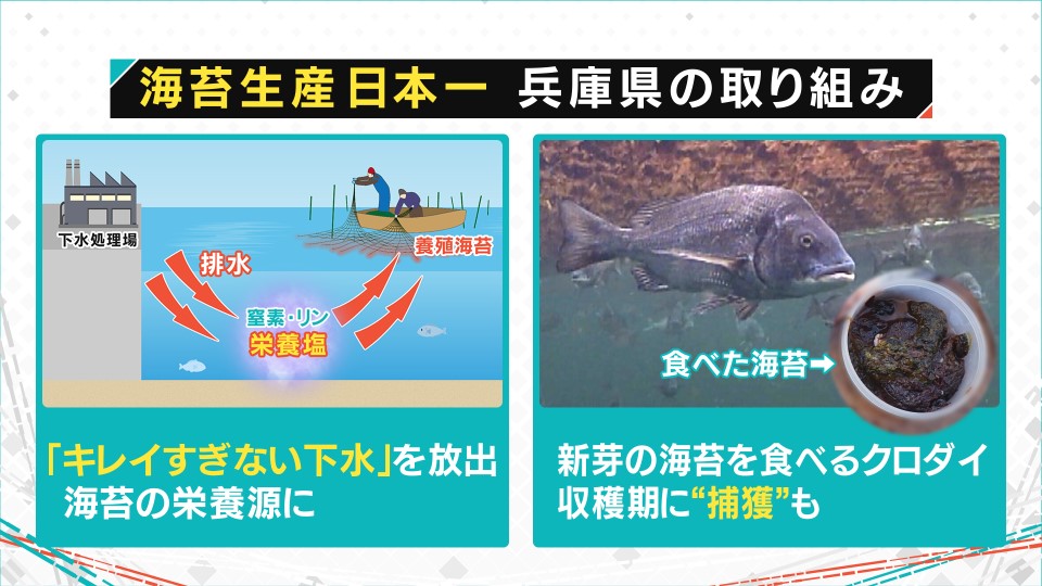 19年連続でノリの生産トップだった佐賀県が天候不良などで不作だったことから、20年ぶりに兵庫県が日本一に返り咲いたわけですが、ノリの生産量を維持するため、さまざまな取り組みをしています。
