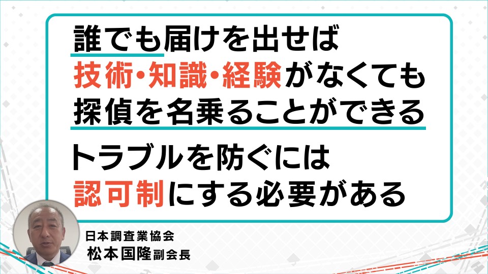 「誰でも届け出を出せば、技術・知識・経験がなくても探偵を名乗ることができる。トラブルを防ぐには、認可制にする必要があります」
