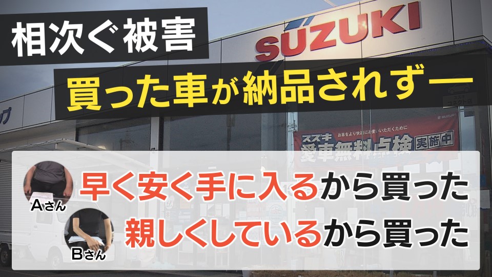 「何が起こっているかも分からなくて、私たちは安くしてもらえるから、そこで買ったんではないんです。長いお付き合いなので、『車買うならそこ』、『車買うならもうスズキ』って買っているので。最初からもうだますつもりだったのではとしか思えなくて。本当にショックでした」