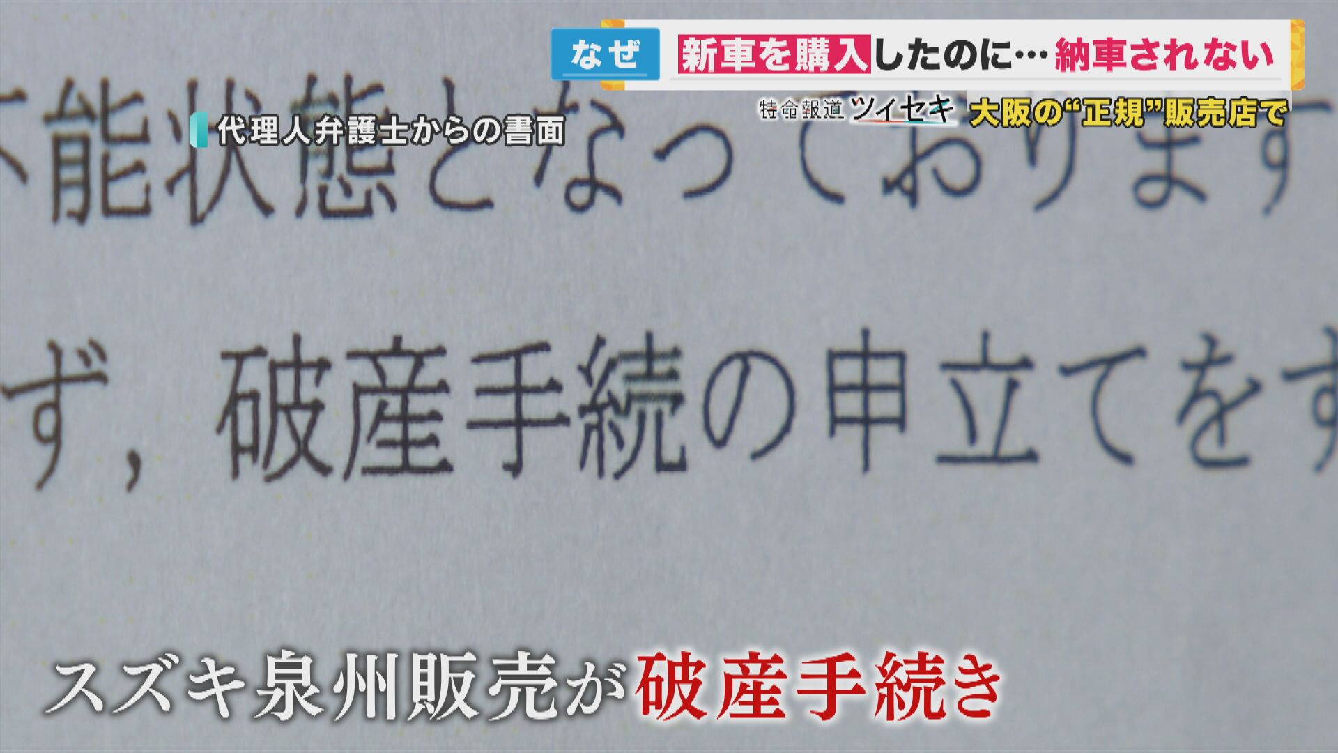 Aさんが5カ月前に払ったおよそ200万円は、販売店のスズキ泉州販売から代理店のスズキ自販近畿に入金されておらず車は渡せないというのです。