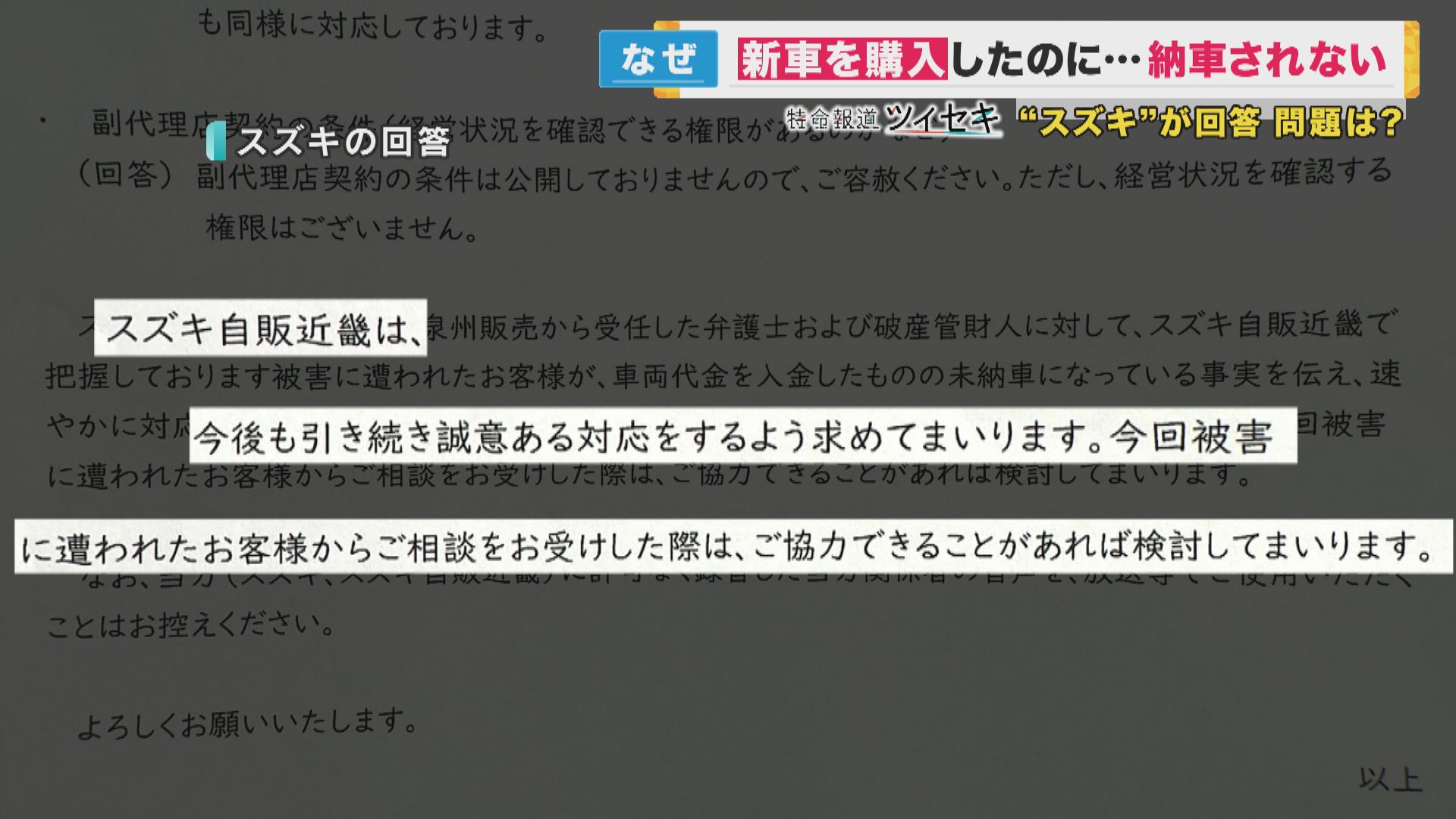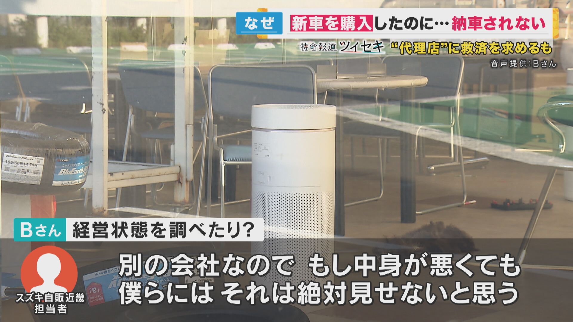 「(スズキ自動近畿に)車の代金は入ってきてないって言っていました。どうもなりませんって。お金払ってくれたら(車を)出せるけど、お金がうちに入ってこない限りはその車はよそに売ってしまうと」