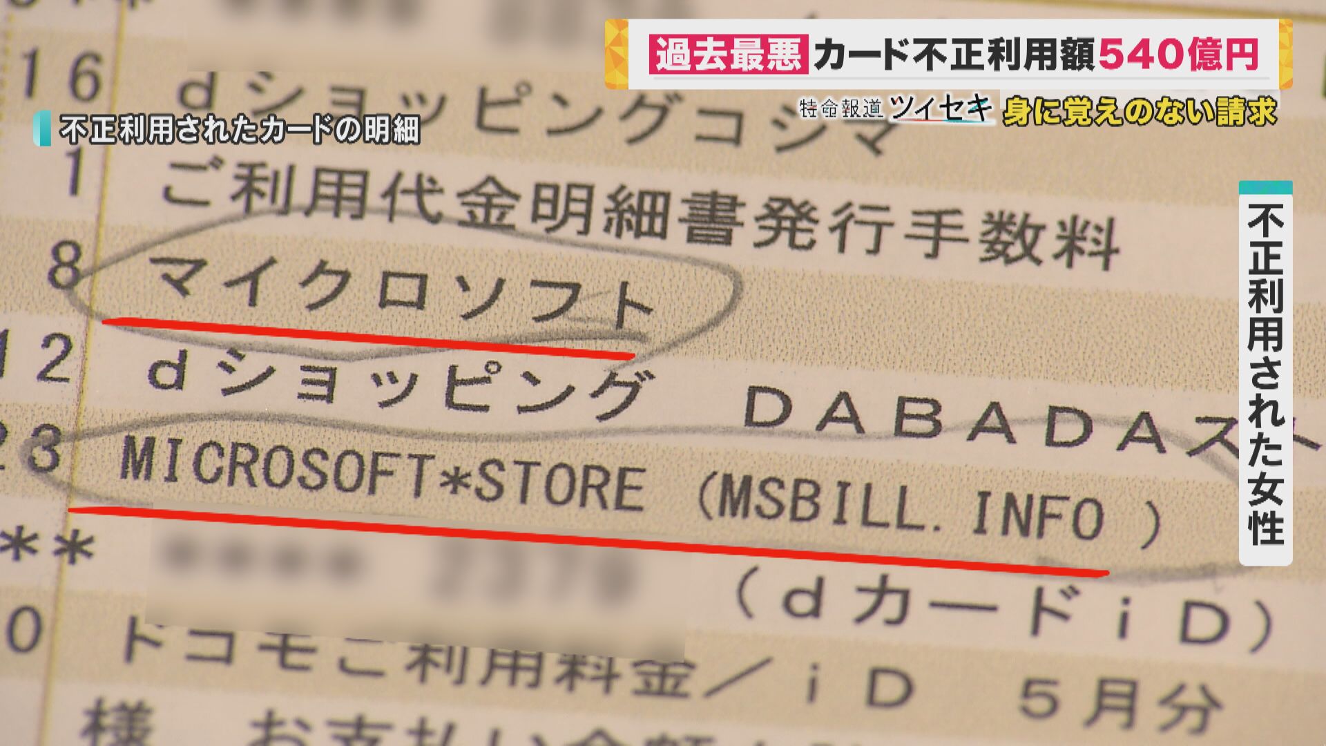 【被害に遭った女性】「カードの明細を見た時に、いつも携帯代の引き落とし金額だけを確認するんですが、『MICROSOFT*STORE』で1850円(が引き落とされていた)」