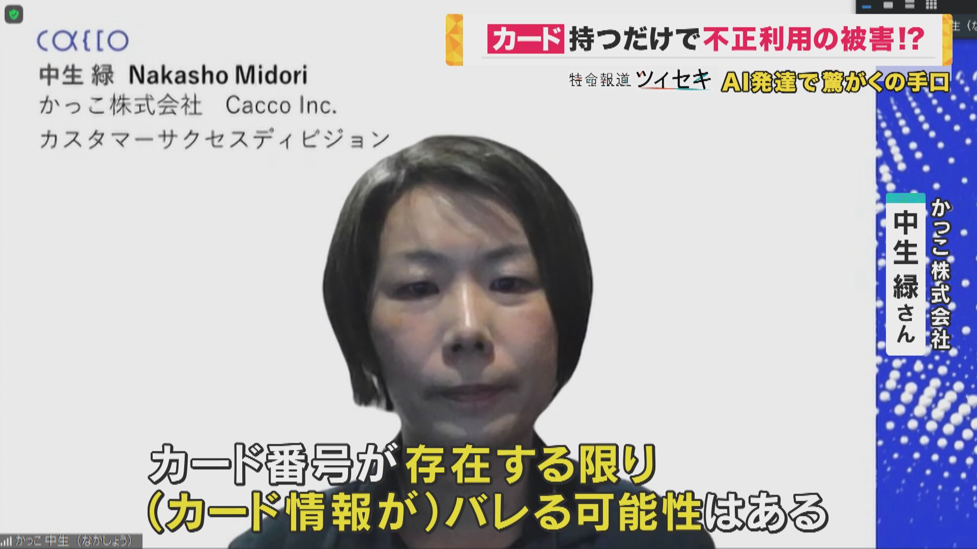【かっこ株式会社 中生 緑さん】「(カードは)タンスに入れていても、金庫に入れていても、クレジットカード番号が存在する限り、(カード情報が)バレる可能性はある。『クレジットマスター』という方法がある」