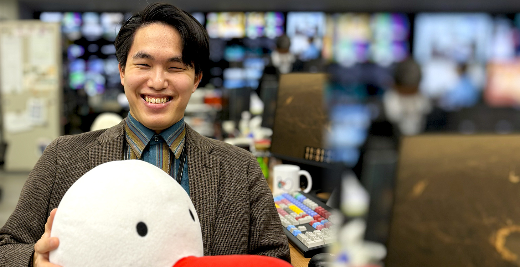 7月に配属されて以来、毎日が編集技術の習得です。放送される映像には「速さ」と「質」が非常に重要であることを痛感しました。配属当初は編集の極意も知らず、大学時代にスマートフォンで編集していた程度の経験しかありませんでした。また、私自身、左目の視力が0、右目も0.1という視覚障がいを抱えています。しかし、職場では皆様に暖かく迎えていただき、編集機も私の視力に合わせて調整していただきました。他の編集の方と同じ速さ、同じクオリティーの編集ができるように、「どうしたらできるようになるか」と、障がい者としてではなく、一人の編集者としてご指導いただきました。その結果、配属から3ヶ月目で、私が編集した映像がオンエアされました。その瞬間は、支えてくださった先輩と喜びのハイタッチを交わしました。