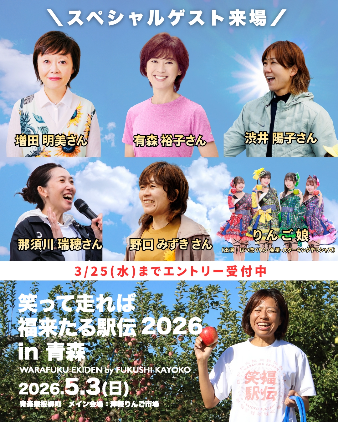 福士加代子が企画、主催を自身で行う 5月3日(日)開催「笑って走れば福来たる駅伝2026in青森」(通称:笑福駅伝・わらふくえきでん)のスペシャルゲストが発表され、女子マラソン界のレジェンドが集結。 豪華メンバーが福士加代子の故郷・青森県板柳町で駅伝チームを組み、タスキを繋ぐ。 レジェンドゲストには、細かすぎる解説でおなじみの増田明美さん、2大会連続メダリストの有森裕子さん、アテネ五輪金メダリストの野口みずきさん、元日本記録保持者の渋井陽子さん、東京マラソン優勝の那須川瑞穂さんの5名が参加。