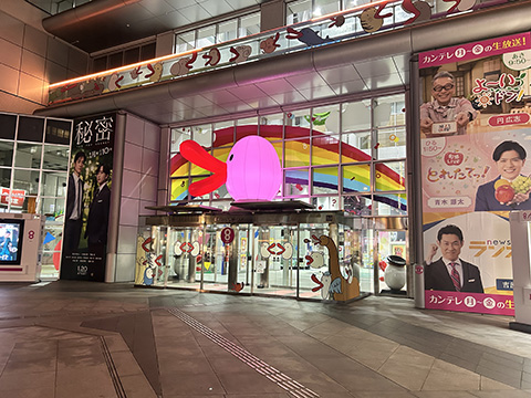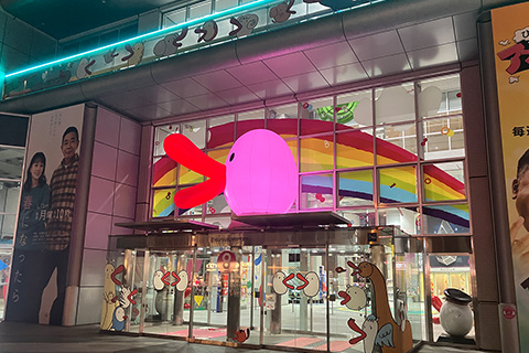 (1)正面玄関前の『ハチエモンバルーン』をピンクにライトアップ(2月19日~26日の夜間)