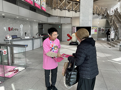 テレビでおなじみのキャラクターとアナウンサーが練り歩き、直接グッズを配布したこともあり、あっという間に配布予定数に到達。1時間ほどでしたが、笑顔あふれる中、イベントは終了しました。2月26日(2月最終水曜)の「ピンクシャツデー」はいじめ反対の意思表示を誰でも簡単に行える運動です。皆さんも「いじめ反対」の気持ちをピンク色で示してください!