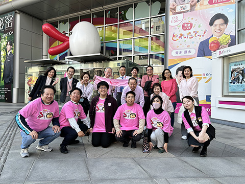 また、お昼休み時間に賛同者有志と共に記念撮影。特製ピンクシャツを着用した人やピンクのセーター、ネクタイなど、色々なピンク色が集い笑顔で記念撮影を行いました。