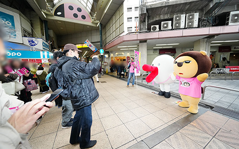関西で人気を誇る、両局のキャラクターが一緒に歩く姿に、商店街を通行中の方々も大興奮。記念写真を一緒に撮ったり、今回のイベントの為に特別に作成した特製クリアファイルを受け取って、「ピンクシャツデー」の事を多くの方に知っていただきました。藤本アナウンサー、MBS松井アナウンサーも一緒に歩き、商店街を行きかう方々にイベントの趣旨を説明しながらグッズをお配りしました。