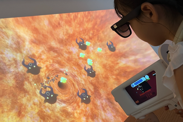 がん細胞が増殖する人体内の世界を舞台にしたシューティングゲームで、プレイヤーは薬という武器として使い分け、がん細胞を撃破していきます。プロジェクションシアターとARグラスを組み合わせることで、細胞が3D映像として目の前に飛び出してきます。プレイヤーは専用に開発した銃型デバイスを使用してがん細胞を撃破し、高得点を目指します。本ゲームでは、がん治療で使用される医薬品の種類による効果の違いを、武器の特性として表現しており、楽しみながらがん治療について学ぶことができます。医薬品の違いによりゲームスコアの加点・減点が起き、ゲーム性の中で違いを体感できる設計にしました。ゲームスコアは「本日のランキング」としてモニター表示しました。