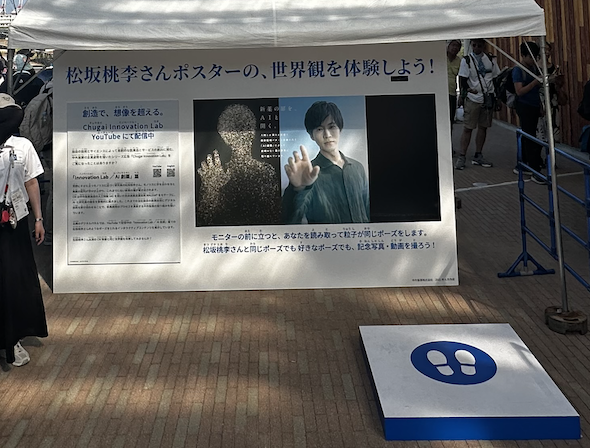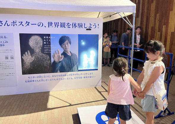サイネージの粒子群がリアルタイムでプレイヤーの動きを真似ます。プレイヤーは自由なポーズをとり写真・動画を撮って頂けました。これは中外製薬株式会社の企業CM「Innovation Lab/AI創薬」篇の世界観を表現したものです。ポスターと同じポーズをとるのもよし、好きなポーズをとるのもよし、子どもから大人まで様々な来場者の方に自由に遊んで頂けました。